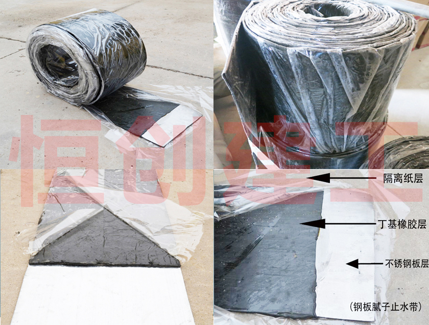 鋼板膩子止水帶是我公司開發的一種新產品.它是一種由特種橡膠、防老劑等材料,經混煉、擠壓后與鍍鋅鋼板粘合而成的一種新型接縫防水、止水產品。能防止各種荷載下產生的彈性、變形及施工縫的溫差變化,起到堅固密封。能有效的防止施工縫漏水,滲水,并對各種作用力起到緩沖作用。鋼板膩子止水帶為綜合性能優良的高分子材料與鍍鋅板復合而成的止水產品。橡塑膩子主體材料為耐老化性能優良的橡塑材料,具有特強的自粘性;夏季高溫不流淌。冬季低溫不發脆;并具有優異的耐水、耐酸堿和耐老化性能;使用壽命長,產品本身無毒,環境良好。為了承受一定的彎曲和壓力。中間來有0.4或0.6mm的鋼板。鋼板膩子止水帶對建筑縫之間提供可靠的防水、防滲功能。鋼板膩子止水帶系列產品包括各種規格型號的產品,并可根據用戶要求,生產各種型號的鋼板膩子止水帶,滿足工程上的實際需要。